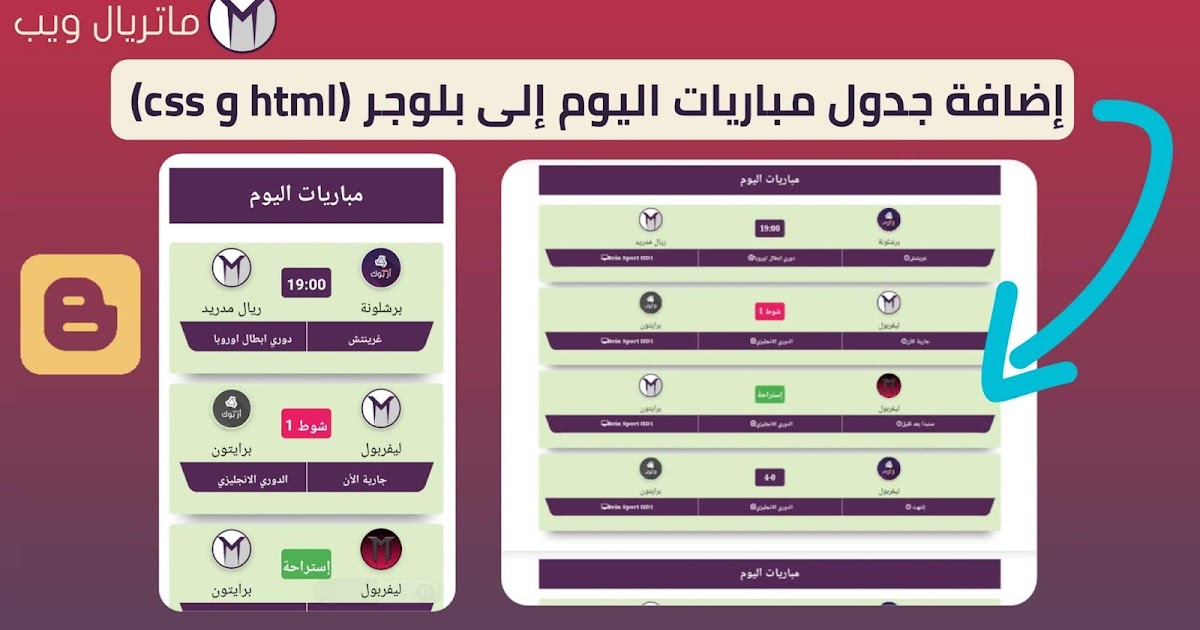 إضافة جدول مباريات اليوم إلى بلوجر Html و Css ماتريال ويب Mdw